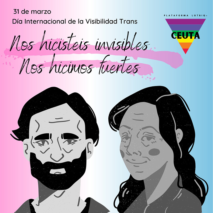En el Día Internacional de la Visibilidad Trans queremos recordar y reivindicar, desde la Plataforma LGTBI+ de Ceuta, que este colectivo no debe estar sujeto a debates o discusiones. Se trata de respetar los Derechos Humanos establecidos y luchar a diario, no solo en una fecha concreta, para combatir cualquier acto de odio, agresión verbal o física, exclusión social o laboral, etc.