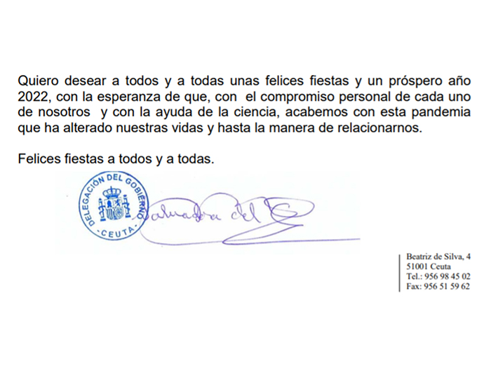 Y tenemos que defender estos valores que forman parte de nuestra manera de ser y de vivir. Ceuta y los ceutíes lo merecemos. Quiero desear a todos y a todas unas felices fiestas y un próspero año 2022, con la esperanza de que, con el compromiso personal de cada uno de nosotros y con la ayuda de la ciencia, acabemos con esta pandemia que ha alterado nuestras vidas y hasta la manera de relacionarnos. Felices fiestas a todos y a todas.