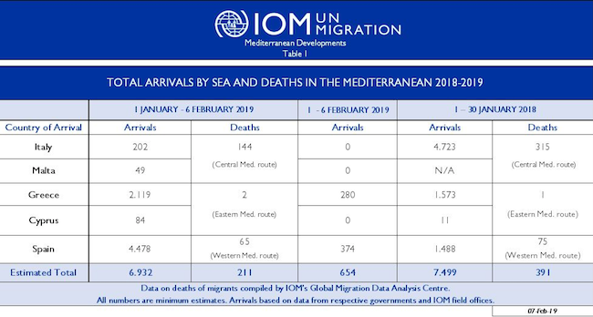 La OIM, la organización de la ONU que mantiene el recuento de llegadas y de muertes de inmigrantes por el mundo, ha cifrado para estos primeros días del nuevo año 2019, entre el 1 de enero y el 7 de febrero pasado, una llegada a España de 4.478 inmigrantes procedentes de las costas africanas marroquíes.
