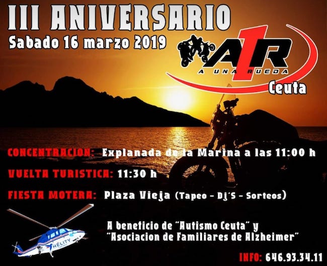 La Asociación 'A 1 Rueda' convoca para este sábado la celeración de su III Aniversario con una concentración de motos, vuelta turística y fiesta motera, y con la venta de papeletas cuyos beneficios van a parar a las asociaciones 'Autismo Ceuta' y Familiares de Alzheimer'.