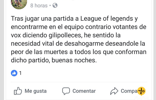 Acostumbrados a críticas exarcebadas, lo que no están dispuestos a soportar son ataques de odio manifiesto que se intuye tras la publicación en un muro personal (no privado) y sí público de un usuario de Facebook por escribir el deseo de "la peor de las muertes" a todos los que conforman VOX.
