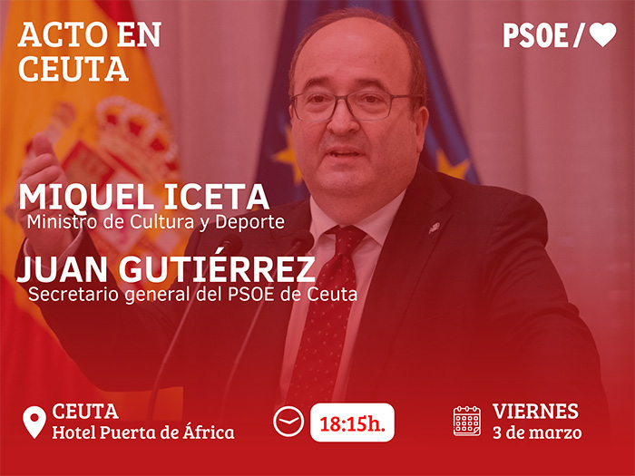 El ministro de Cultura y Deporte, Miquel Iceta (PSC), participará en un acto en Ceuta para apoyar la candidatura de Juan Gutiérrez a presidente de la Ciudad Autónoma, según informa un comunicado remitido por el PSOE ceutí.