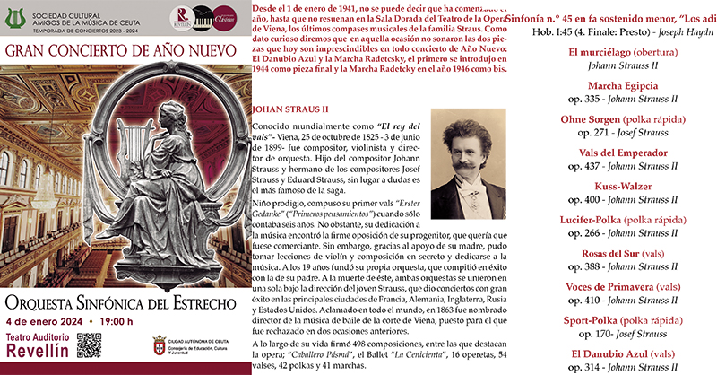 La Consejería de Educación, Cultura y Juventud, en colaboración con la Sociedad Amigos de la Música, ha organizado el Gran Concierto de Año Nuevo, que se celebrará el próximo 4 de enero a las 19.00 horas en el Teatro Auditorio del Revellín, a cargo de la Orquesta Sinfónica del Estrecho.