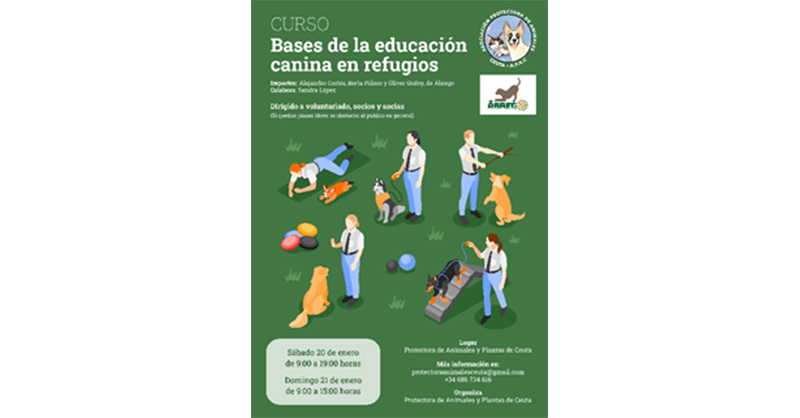 La Protectora de Animales y Plantas de Ceuta ha organizado un curso sobre educación canina que se celebrará los días 20 y 21 de enero. Inicialmente, fue fechado para los días 16 y 17 de diciembre, pero tuvo que ser pospuesto debido a que el temporal imposibilitaba el desplazamiento de los formadores. Titulado ‘Bases de la educación canina en refugios’, está principalmente dirigido al voluntariado, así como a los socios y socias.