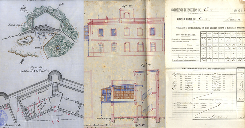 En 1894 se creó la Real Sociedad Colombófila Española, cuyo primer presidente fue el Comandante de Ingenieros Pedro Vives y Vich, quien destacó por tratar de adaptar las afamadas palomas belgas a las condiciones de nuestro país. El 16 de junio de 1898 se publicó en la Gaceta de Madrid un importante Real Decreto sobre palomas mensajeras, que partía de la Presidencia del Consejo de Ministros, que regentaba entonces el liberal Mateo Práxedes Sagasta. Entre la documentación del Archivo Intermedio Militar de Ceuta sobresale un expediente del fondo de la Comandancia de Obras de Ceuta, Sección 3ª de Material, Subsección 3ª de Ingenieros, que proyectaba en 1898 un edificio destinado para palomar militar en la fortaleza del Hacho. Allí se planificaba todo un nuevo edificio en la zona del antiguo almacén del Baluarte de San Antonio, emplazado allí desde el siglo XVIII.