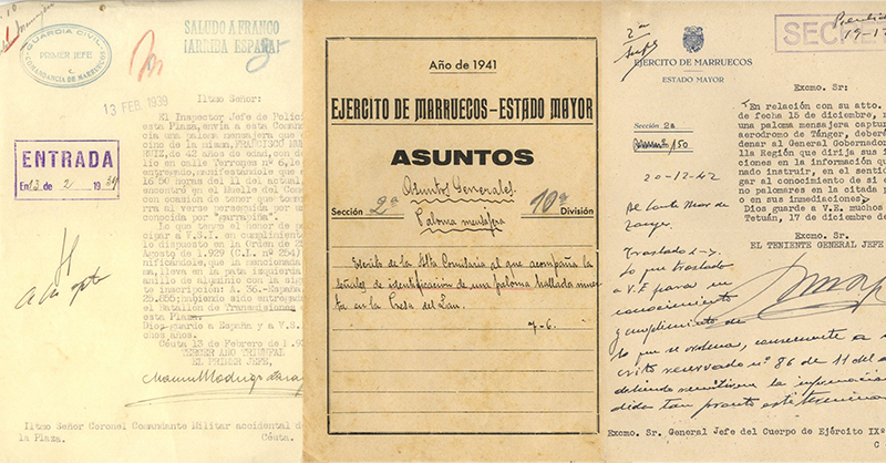 El Archivo Intermedio Militar de Ceuta custodia entre sus numerosos tesoros, abundante documentación sobre palomas mensajeras, tal y como narramos en artículos precedentes. Durante la Segunda Guerra Mundial, cuando la tensión fue máxima, el hallazgo de palomas mensajeras anilladas fue seguido muy de cerca por las autoridades de la época. Entre 1939 y 1945 fueron localizadas muertas o capturadas vivas varias palomas mensajeras de diversas nacionalidades en el territorio del Protectorado. La posibilidad de que portasen mensajes trascendentes en tiempos de guerra, siempre subyace en el seguimiento del tema. A la altura de 1942 observamos que ciertos documentos sobre palomas mensajeras comenzaron por primera vez a ser clasificados con el sello de secreto o reservado; al mismo tiempo que el interés por la colombofilia era ya una tradición heredada que procedía del último cuarto del siglo XIX, donde nuestros ingenieros militares siempre llevaban el control y entrenamiento de tan apreciadas aves, como una rama más de la amplia maquinaria del Ejército.