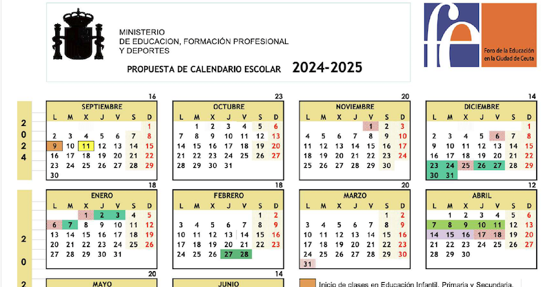 En la reunión del Pleno celebrada ayer, el Foro de la Educación ha decidido presentar su propuesta de calendario académico para el curso académico 2024-2025. Dicha propuesta quedará pendiente de estudio y posterior aprobación, si procede, por parte del Ministerio de Educación, Formación Profesional y Deportes. Tras un análisis y deliberación de las diferentes alternativas planteadas en el Pleno, y teniendo en cuenta la realidad social de la ciudad y las festividades religiosas de los distintos credos de la ciudadanía ceutí, se ha alcanzado un consenso para presentar al MEFPD, como propuesta de calendario escolar del Foro de la Educación de Ceuta, la que aparece en el archivo que se adjunta en el presente correo electrónico.