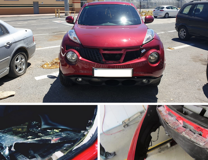 Componentes de la Compañía Fiscal y Grupo Cinológico de esta Comandancia que prestan servicio de reconocimiento de los vehículos que embarcan en los Ferrys con destino a Algeciras, al realizarlo sobre el vehículo marca “NISSAN-JUKE”, de matrícula nacional, detectaron la posibilidad de existencia de sustancia estupefaciente en su interior.