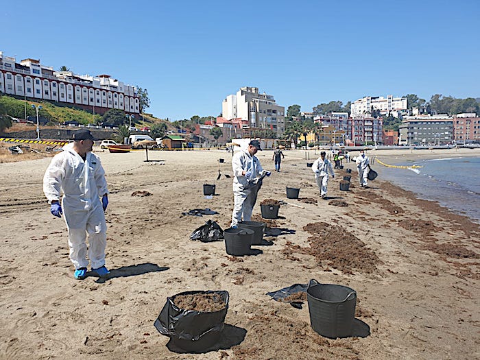Una veintena de operarios de la empresa Ecoceuta limpian la playa de Benítez que se ha cerrado al baño en esta mañana por la presencia de fuel de un vertido procedente del mar que, con probabilidad, haya tenido su origen en algún buque en su paso por el Estrecho y que la marea ha traído hasta la playa.