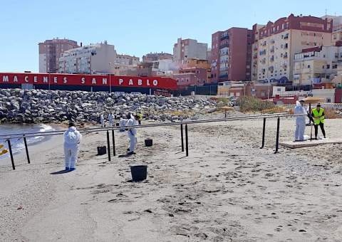 La zona de baño desde San Pablo hasta la desaladora ha quedado cerrada al público mientras que las tareas de limpieza, a mano, se llevan a cabo.