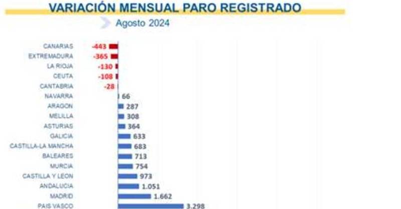 Recapitulando sobre la bajada del número de parados en Ceuta, el paro registrado baja en agosto en cuatro comunidades autónomas, las mayores caídas en cifras absolutas se producen en: Canarias (-443 personas), Extremadura (-365 personas) y La Rioja (-130 personas), seguido de Ceuta (-108) y Cantabria (-28).