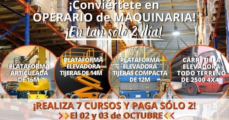 Esta formación, que incluye 6 cursos especializados en el manejo de maquinaria clave, además de un curso adicional para operarios de almacén, tendrá lugar en las instalaciones de una empresa del Sector, los próximos 02 y 03 de octubre, en horario de tarde. Lo más destacado de esta oferta es que los estudiantes sólo pagan 1 curso y obtienen 7 Certificados, brindando una oportunidad inigualable de formación integral a un precio reducido.