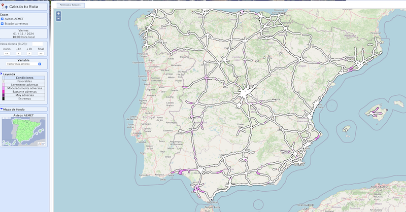 MeteoRuta es un visor de mapas, a través del cual el usuario obtiene de un vistazo las diferentes variables meteorológicas que pueden afectar a la circulación rodada. Entre estas variables, puede filtrar aquellas que más le interesen como la precipitación, la temperatura, el viento o la nieve y además, seleccionar la hora a la que se va a viajar. La aplicación MeteoRuta clasifica las condiciones de las carreteras desde favorables a extremas por colores dependiendo de la superación de los umbrales establecidos.