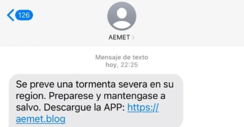 El mensaje falso contiene un enlace (https://aemet.blog) que parece ser la app oficial de la AEMET. Sin embargo, al hacer clic en el enlace, se descarga un programa malicioso en el dispositivo, poniendo en riesgo los datos privados del usuario.