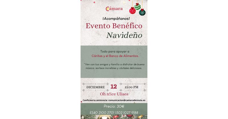 La Cámara de Comercio de Ceuta ha anunciado la celebración de su tradicional Evento Benéfico Navideño, que se llevará a cabo el próximo jueves 12 de diciembre a las 13:00 horas en el Hotel Oh N!CE Ulises. Este evento tiene como propósito recaudar fondos para el Banco de Alimentos y Cáritas, dos organizaciones que luchan contra la pobreza y el hambre en la ciudad.