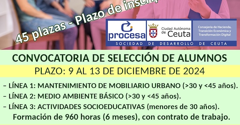 Mediante Decreto de la Presidencia del Consejo de Administración de PROCESA, el pasado 22 de octubre de 2024 y se encuentran publicadas en el Bocce Nº6456, de 29 de octubre de 2024, se aprueba la convocatoria para la selección de las entidades sin ánimo de lucro para la ejecución de los talleres de formación y empleo “Trabajando para ti”. El pasado día 20 de noviembre, se aprobó la propuesta de resolución provisional de las entidades participantes, habiéndose presentado una única entidad para la ejecución de los tres talleres, Ceforem Ceuta, siendo publicada la propuesta provisional en Bocce de 29 de noviembre de 2024.