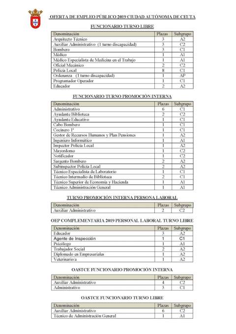 En esta OEP 2019 están contempladas plazas en turno libre, de promoción interna y se encuentra la complementaria del Organismo Autónomo Servicios Tributarios con plazas de turno libre y de promoción interna, para funcionarios y personal laboral.