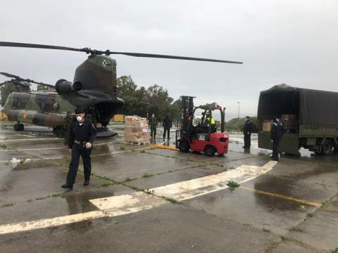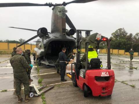 Se trata de 10.000 mascarillas y una importante remesa de geles desinfectantes que han transportado desde la península un helicóptero Chinook del Ejército de Tierra