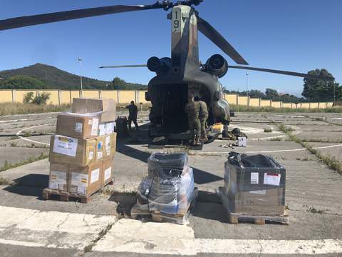 La Comandancia General de Ceuta ha informado de que hoy, viernes 5 de junio, han realizado la distribución de tres palés con un peso aproximado de 386 kilogramos con destino al almacén de suministros del Hospital Universitario de Ceuta después de su transporte, primero por un helicóptero HT-17 Chinook perteneciente a las Fuerzas Aeromóviles del Ejército de Tierra (FAMET) y después, por un vehículo de la ULOG 23.