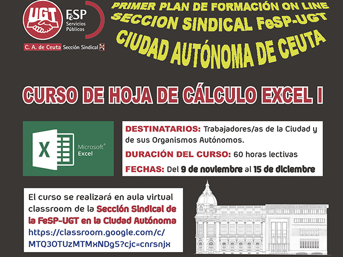 La Sección Sindical FeSP-UGT de la Ciudad Autónoma de Ceuta organiza el primer Plan de Formación online de la Ciudad Autónoma de Ceuta y sus Organismos Autónomos, que comenzará con la acción formativa 'Curso de hoja de cálculo Excel I'.
