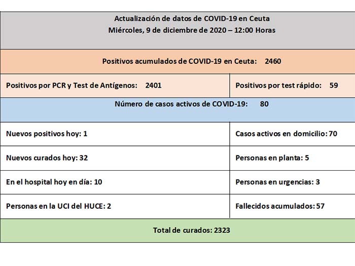 El Instituto Nacional de Gestión Sanitaria (INGESA) informa de los datos actualizados de la pandemia del COVID-19 en Ceuta y entre la tarde de ayer y la mañana de este miércoles 9 de diciembre se ha detectado un nuevo positivo y se han confirmado 32 nuevos curados.