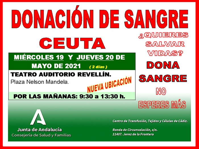 El Centro de Transfusión, Tejidos y Células de Cádiz, al que pertenece Ceuta, ha organizado una donación de sangre los próximos días 19 y 20 de mayo, de 9.30 a 13.30 horas, en el Auditorio del Revellín. "Vivimos fechas muy complicadas por motivo de la pandemia y a medida que la incidencia baja, los hospitales a vuelven a la normalidad y un reflejo de esta recuperación es el aumento de la demanda hospitalaria de transfusiones de sangre. Por esto, necesitamos un mayor aporte de donaciones de sangre. Cada día necesitamos 180 donantes de sangre", han demandado desde el centro.