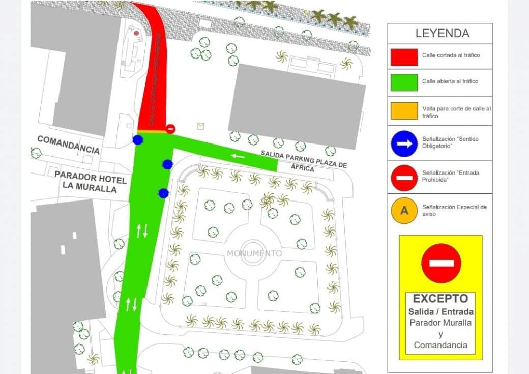 Debido a ello, el tráfico rodado no podrá acceder a  la plaza de África desde la calle Independencia, dejando esa calle con acceso únicamente para los trabajadores y usuarios de los aparcamientos ubicados en el Parador Hotel La Muralla y Comandancia. La salida de esta zona también se realizará por el cruce mencionado, tal y como viene recogido en el plano adjunto.