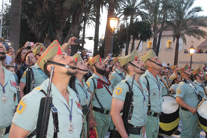 Tras los saludos y emociones en las miradas y los suspiros de la gente que se iba agolpando a los alrededores de la Plaza de África pude asistir a la Salida Procesional  de los Sagrados Titulares a los acordes del Himno Nacional así como el cuplé que se convirtió en Himno hace ahora cien años en la Legión.