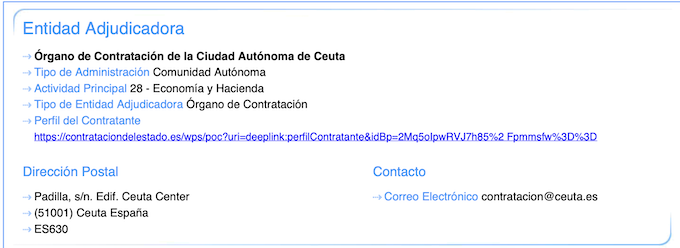 La entidad adjudicadora, el Órgano de Contratación de la Ciudad Autónoma, dependiente de la Consejería de Economía y Hacienda recibirá ofertas hasta el 28 de marzo y un día más tarde, el 29, en un acto que no será público, se abrirán las plicas (ofertas) con la documentación administrativa y, en su caso, también las económicas. Este acto se llevará a cabo en la sala de juntas de la Consejería sita en el edificio Ceuta Center a las 12.00 horas del mediodía.